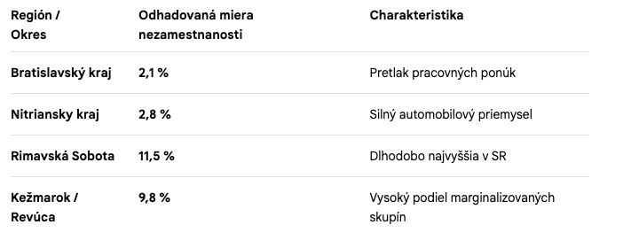 - Štrukturálna nezamestnanosť: Väčšina nezamestnaných sú dlhodobo evidovaní, ktorých zručnosti nezodpovedajú potrebám trhu (digitalizácia, AI).