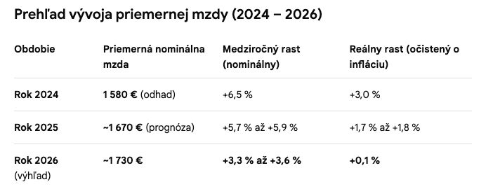 Vývoj priemernej mzdy na Slovensku v posledných mesiacoch kopíruje trend spomaľovania inflácie, čo po dlhšom čase prináša ľuďom reálny nárast kúpyschopnosti. Podľa najnovších dát Štatistického úradu SR a prognóz Národnej banky Slovenska (NBS) vyzerá vývoj nasledovne: