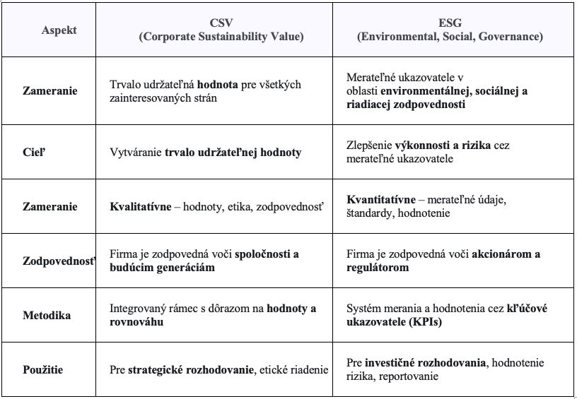 Porovnanie CSV (z ang. Corporate Sustainability Value) s ESG (z ang. Environmental, Social, Governance) je relevantné, pretože obe sú rámce zamerané na trvalú hodnotu v podnikaní, ale s rozdielnym prístupom.