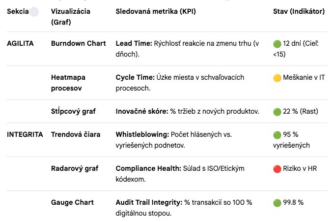 Príklad dynamického dashboardu kombinuje vizuálne prvky, ktoré okamžite signalizujú kritické oblasti v reálnom čase. Takýto report by sa v digitálnych nástrojoch (ako PowerBI) delil na dve hlavné sekcie: agilita a integrita (návrh dizajnu dashboardu viď na obárzku).
